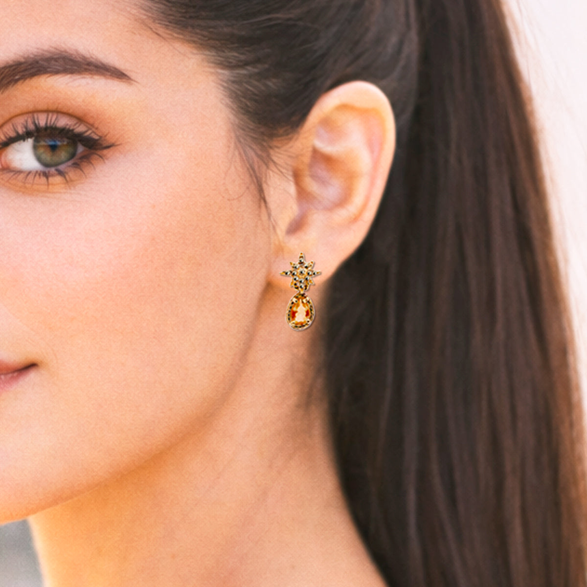 Los Aretes Mini Polaris con Drop Mango están inspirados en la estrella que guía. Fabricados en plata .925 y baño de oro de 14k, son una pieza delicada pero con brillo protagonista.