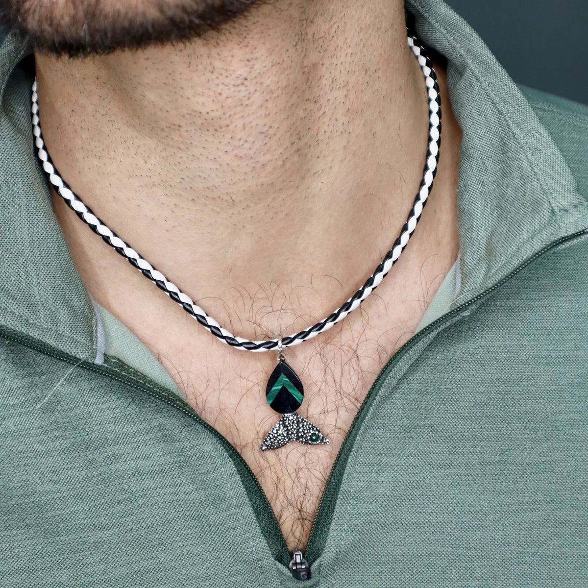 Black and white braided rubber necklace with .925 silver whale tail pendant and onyx mosaic with malachite.